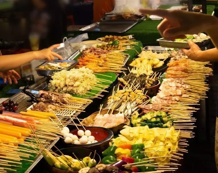 Næste stop er et lokalt natmarked, hvor du får tid til at gå rundt mellem de mange boder. Her bliver du klogere på lokale delikatesser, f.eks. braiseret svineben (khao kha mu), kokosbudding og sticky rice med æg (bua loi khai waan).