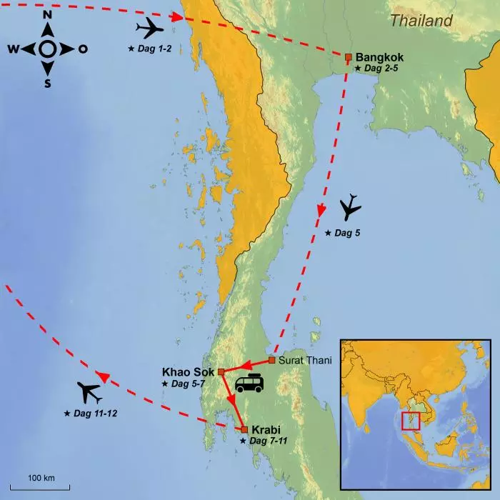 Du bliver hentet på hotellet og kørt i lufthavnen, hvorfra du flyver mod syd til Surat Thani – en flyvetur på 1 time og 15 minutter. Efter landing samler du din bagage op og mødes med din chauffør, som står med et TourCompass-skilt ude i ankomsthallen. Han kører dig til Khao Sok Nationalpark, hvor et sandt jungleeventyr venter.