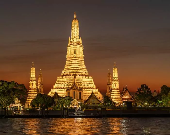Undervejs får du et glimt af Bangkoks populære vartegn, der er smukt oplyst om aftenen. Du ser bl.a. Demokratiets Monument, der markerer Thailands afskaffelse af absolut monarki og indførelsen af et konstitutionelt monarki.  Monumentet ligger ved den travle avenue Ratchadamnoen – ikke langt fra Kongepaladset, Grand Palace.