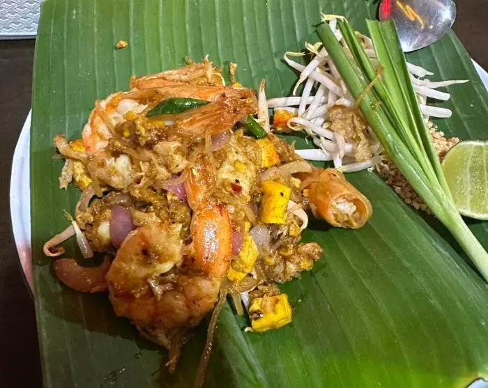 Du ankommer til en populær Pad Thai-restaurant, der er klassificeret som en Bib Gourmand-restaurant. Bib Gourmand er en udmærkelse, som Michelin-guiden tildeler restauranter, der serverer veltillavet mad til rimelige priser. Her får du serveret den velsmagende nationalret på bananblade, og du kan også komme med i køkkenet og se, hvordan det hele foregår.