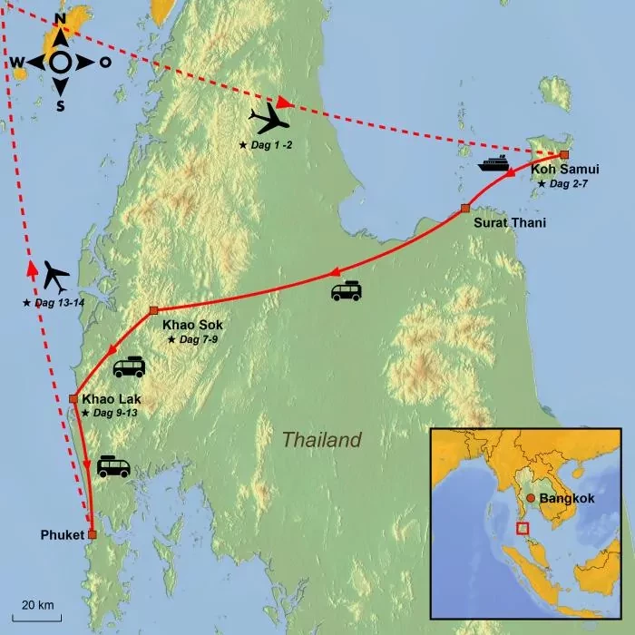 Rejsen starter på Thailands næststørste ø, Koh Samui. Glæd dig til en spændende ø-rundtur, hvor du oplever Big Buddha, stenformationerne Hin Yai og Hin Ta og et af øens mest berømte vandfald. Resten af dagene på Koh Samui er uden aktiviteter og du bestemmer selv, om dagene står på afslapning eller spændende naturoplevelser til f.eks. Ang Thong Marine Nationalpark eller dykkerparadiset Koh Tao.
