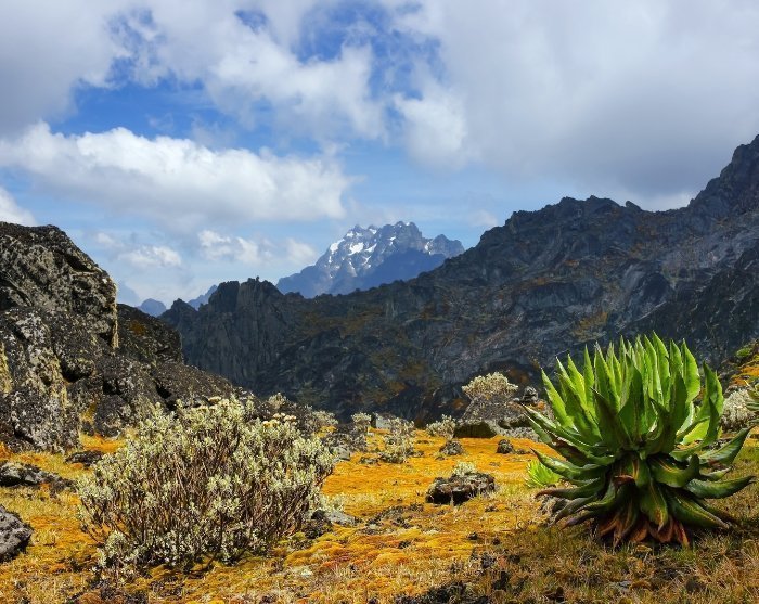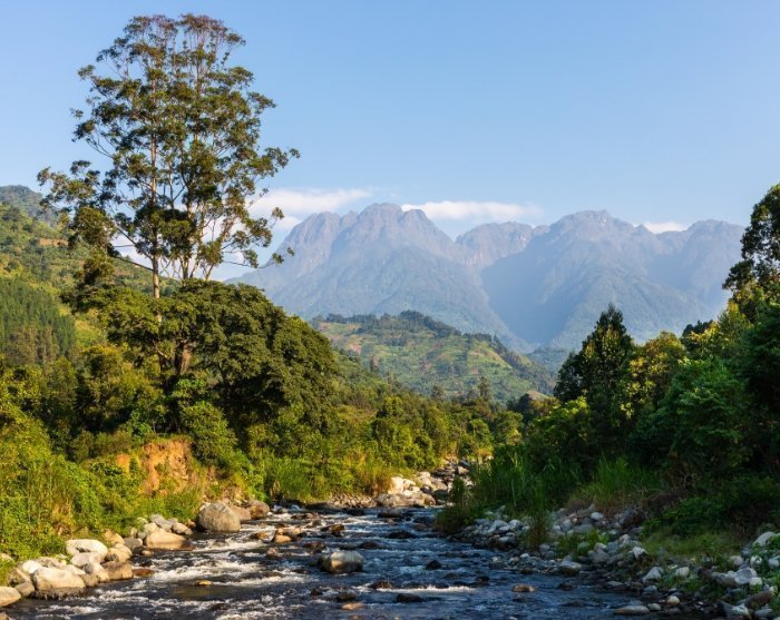 Fra højderyggene omkring Kibale har du en fænomenal udsigt over de bløde, grønne bakker med Rwenzori bjergene i baggrunden.