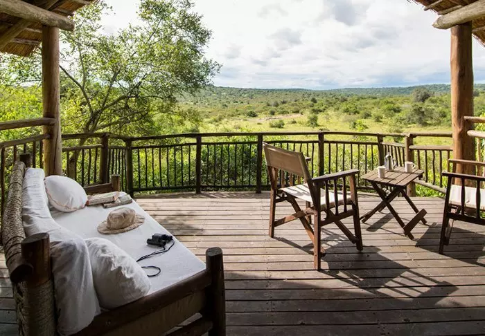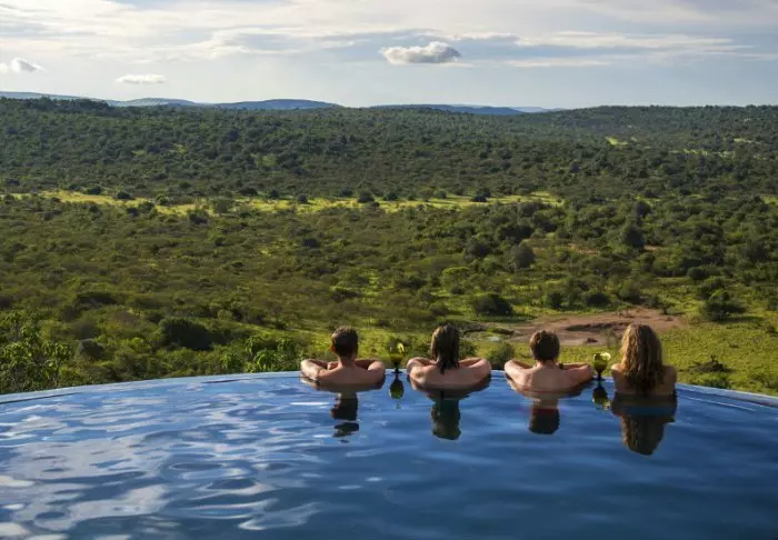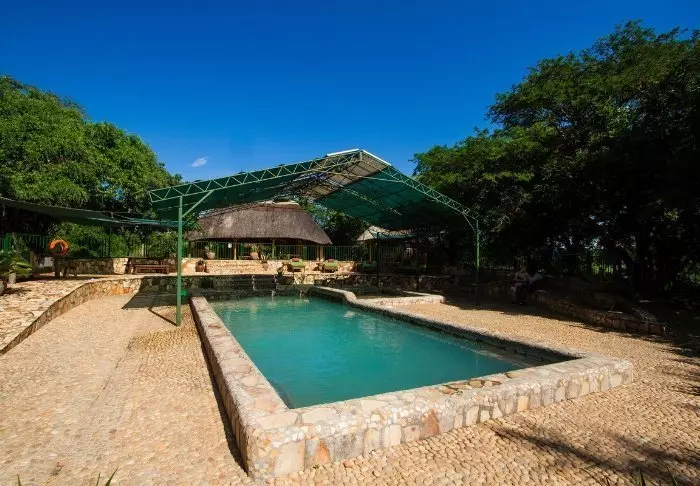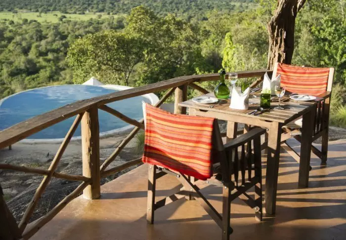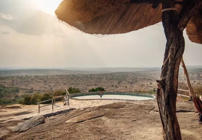 Fra lodgens swimmingpool kan du nyde den fantastiske udsigt over dalen nedenfor, hvor bøfler, impalaer, vortesvin, zebraer og flere andre af savannens dyr gerne samles ved vandhullet. På klippesiden kan du også være heldig at spotte en af de sjældent sete klippespringere, der hører til dér.