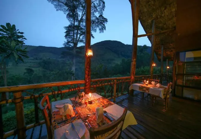 Hovedbygningen med restaurant, bar og loungeområde er placeret på toppen af skråningen og giver dig ikke blot en billedskøn udsigt, men også masser af ren, frisk luft fra skoven og dens mange træer, mens du får dig en bid mad. Fra hovedbygningen går en sti, som fører dig direkte til Rushaga-porten og ind i nationalparken.