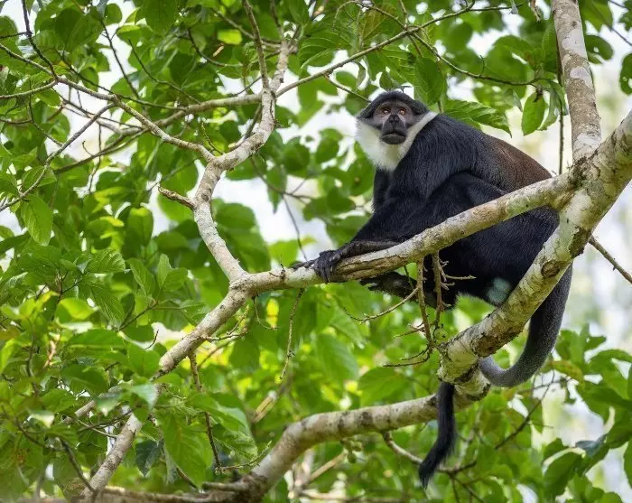 Hvor du i Murchison Falls kan opleve store variationer i landskabet med både flod, savanne, sump og skov, er Kibale kendetegnet ved primært at bestå af tæt, fugtig regnskov. Det er et af de bedste steder i Afrika at se primater i det fri. Chimpansen er nok den mest kendte af dem alle, men her i skovene findes også både den røde colobusabe og den sort-hvide colobusabe, den flotte L’Hoest’s abe samt flere andre arter.