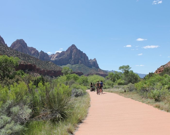 Fra marts til november er shuttlebusserne det eneste tilladte køretøj på den populære rute, Scenic Drive, hvilket gør cykling behagelig og sikker. Shuttlebusserne passerer ikke cyklisterne, medmindre cyklisterne gør stop med den ene fod på jorden. Om nødvendigt kan man få sin cykel læsset på forsiden af en shuttlebus.