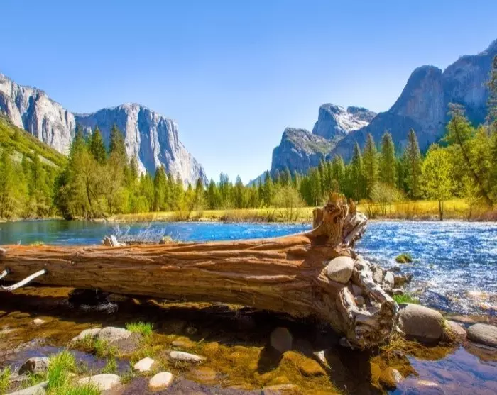 Gletsjerskabte bjerge skyder op i horisonten, mens den iskolde og brusende Merced River skærer sig smukt gennem Yosemite-dalen.
