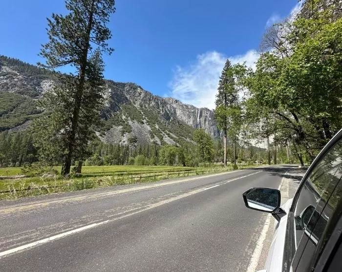 Som du nærmer dig parken (via Arch Rock Entrance), vil du opleve, hvordan byliv efterhånden afløses af golde landskaber og til sidst bjerge: Sierra Nevada-bjergene, hvor Yosemite ligger. Den sidste times kørsel ind til selve Yosemite-dalen er ubeskrivelig smuk med lodrette klippevægge, grantræer og den brusende flod, Merced River, der følger dig hele vejen.
