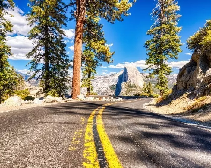 Et andet af parkens uforglemmelige udsigtspunkter er Tunnel View, hvor du får et fantastisk syn over Yosemite-dalen, Bridalveil Fall samt de ikoniske bjerge El Capitan og Half Dome.