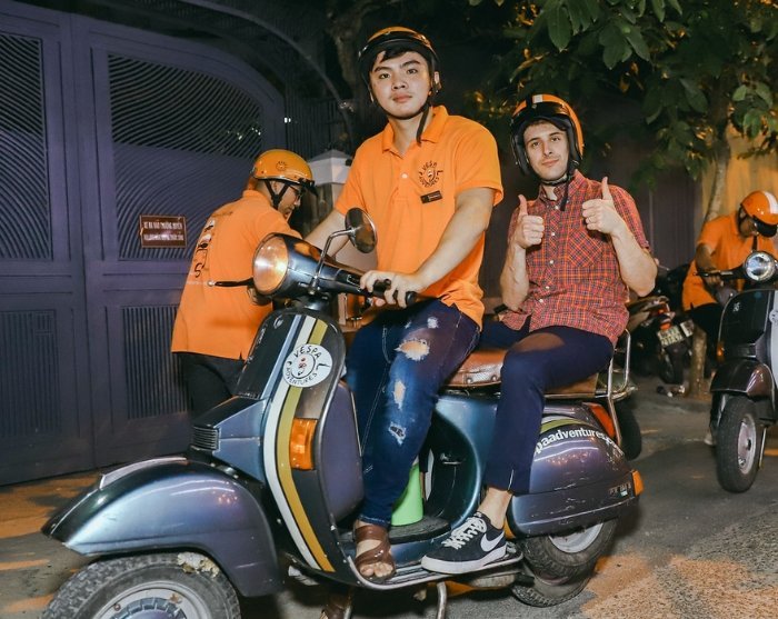Du bliver hentet på hotellet af din guide, og en Vespa-chauffør står klar til at vise dig Ho Chi Minh City efter mørkets frembrud. Efter udlevering af hjelm hopper du op bag på scooteren og bliver med ét en del af millionbyen.