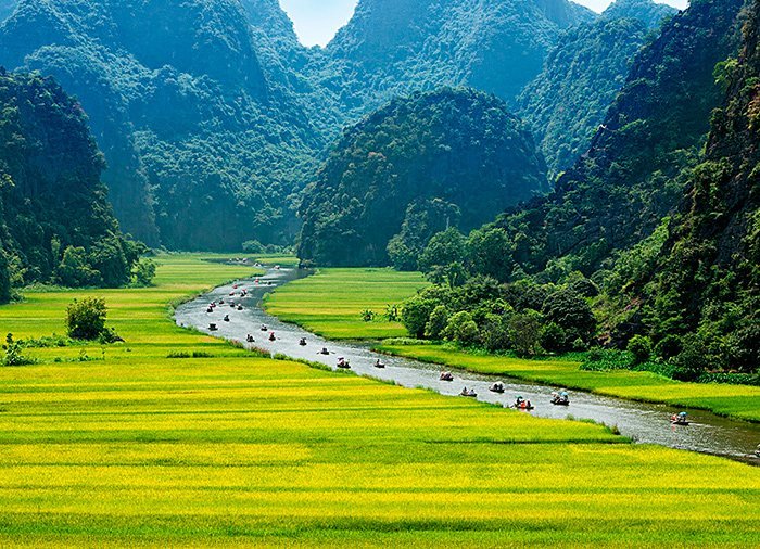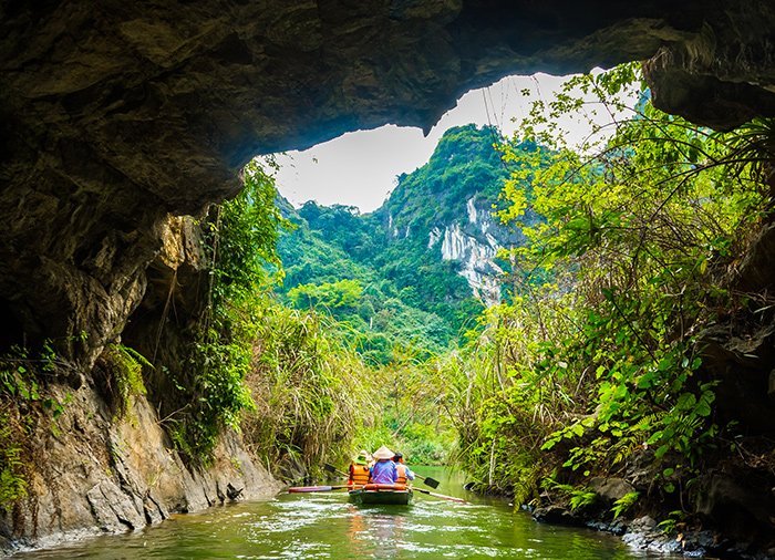 I det nærliggende Trang An går du ombord på en sampan – en lille flad træbåd. Læn dig tilbage og nyd den 2,5 times sejltur, men du stille vugger på floden gennem maleriske landskaber blandt bølgende rismarker og grønklædte kalkstenslipper, der skyder op i landskabet. Landskaberne er på UNESCOs verdensarvsliste og kaldes Ha Long-bugten på land. Undervejs sejler du gennem flere grotter og kan nyde det rige fugleliv. På land igen går turen tilbage til Hanoi.