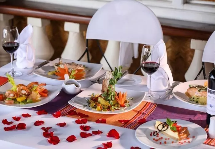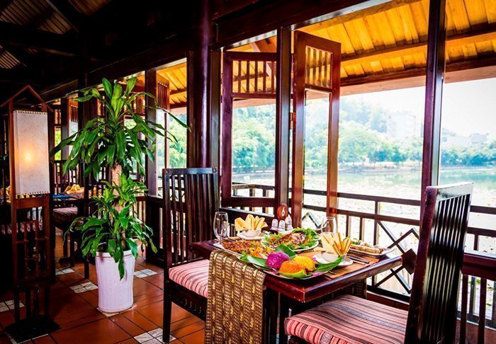 Restauranten ombord byder på vietnamesiske retter lavet af lokale råvarer og krydret med eksotiske smage. Maden serveres i en hyggelig træindretning, der skaber en romantisk stemning.