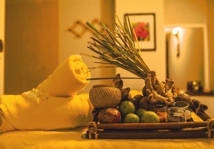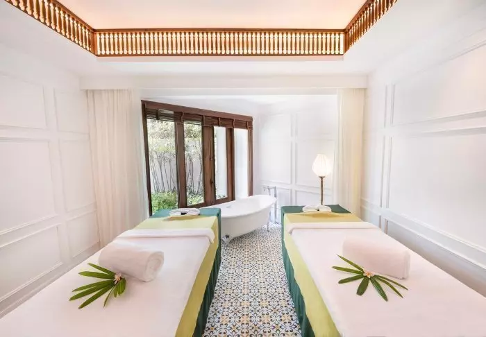Efter en skøn dag i solen, kan du forkæle dig selv med en afslappende behandling i spaafdelingen, som ligger fordelt i små pavilloner med afskærmning.