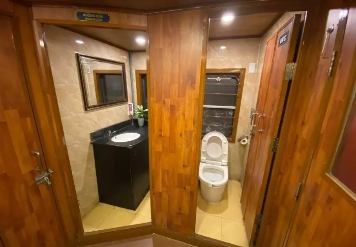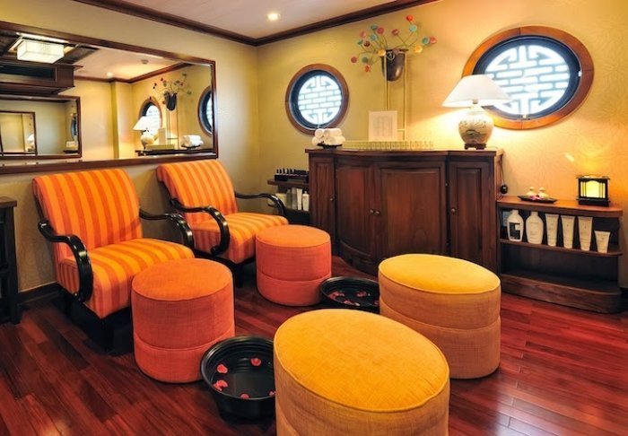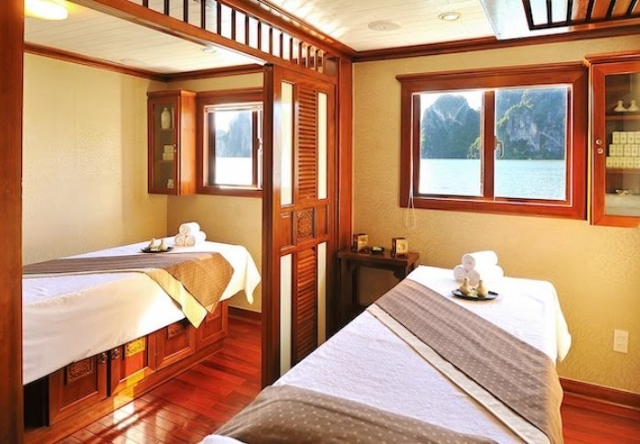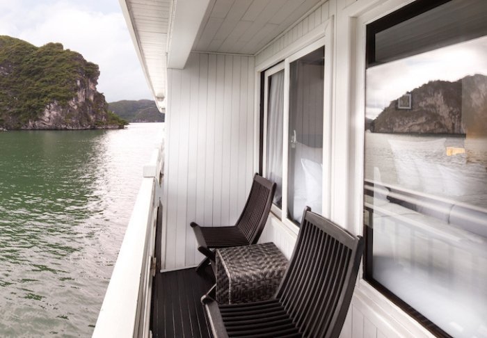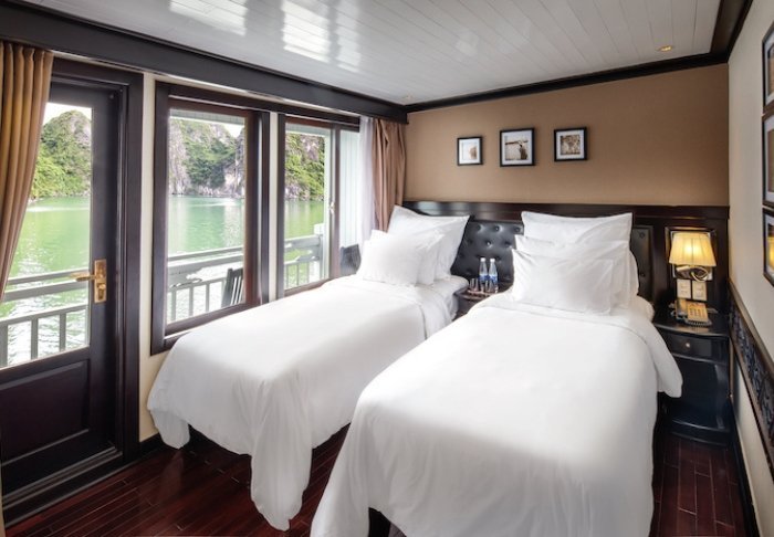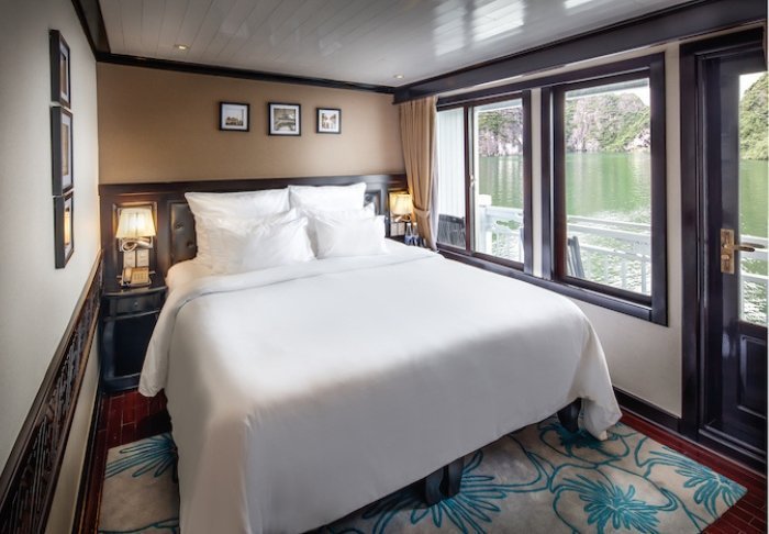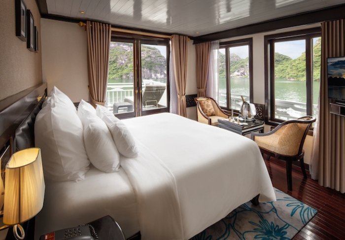 Skibet har 24 kahytter fordelt på to dæk, og indretningen er inspireret af vietnamesisk håndværk og kultur. Kahytterne har mørke træpaneler, kunstfærdige detaljer og store panoramavinduer ud mod bugten. Alle har aircondition, minibar, værdiboks, te- og kaffefaciliteter samt badeværelse med både badekar og separat bruser. Det er rummelige kahytter, der kombinerer varme materialer med moderne bekvemmeligheder. Med andre ord: en indbydende base mellem dagens oplevelser.