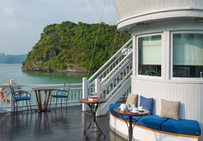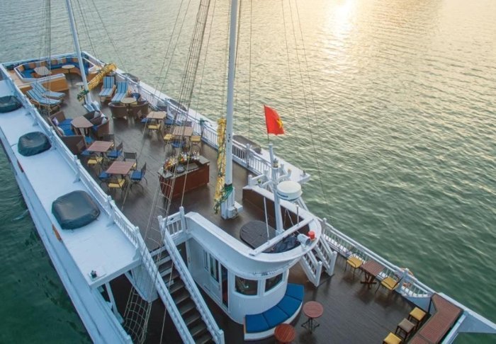 Ombord er der både solterrasse og restaurant, hvor der serveres friskfanget seafood og vietnamesiske klassikere, mens skibet glider gennem det betagende landskab. Om dagen lægger båden til ved øde øer og små fiskerlandsbyer. Du kan tage med på udflugter i kajak, besøge grotter eller hoppe direkte i vandet fra skibets agterende. Om aftenen er der ro, stilhed og stjernehimmel, og måske en kold drink på dækket.