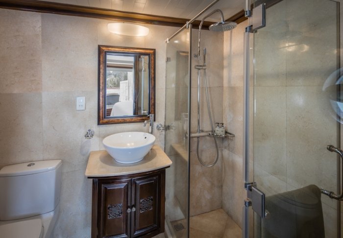 Du overnatter i en deluxe ocean view kahyt på første dæk med store vinduer, der åbner op for bugtens udsigt, så du kan vågne til solens første stråler og falde i søvn til havets stille skvulp. Kahytten er 20 m² og indrettet med dobbeltseng eller to enkeltsenge, aircondition, minibar, tv, værdiboks og eget badeværelse med bruser. Der er plads til to voksne og ét barn.