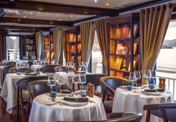 Restauranten serverer retter fra både det vietnamesiske og internationale køkken, tilberedt af råvarer af høj kvalitet. Atmosfæren er stilfuld, og middagen på dækket med solnedgangen som kulisse bliver et af rejsens højdepunkter.