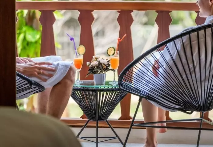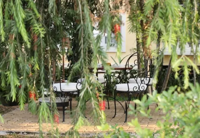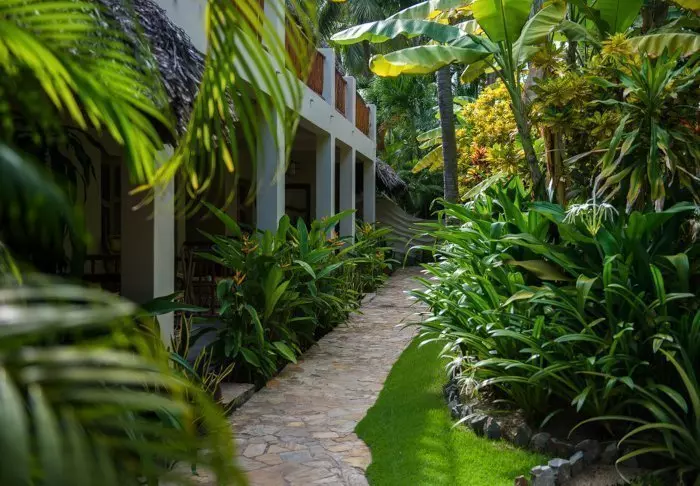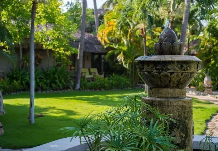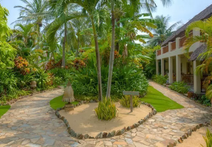 Resortets 30 værelser ligger spredt som bungalower i den frodige have. Her er rislende vand, farverige blomster og små skyggefulde hjørner, du kan dase i.