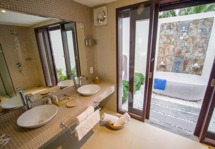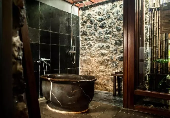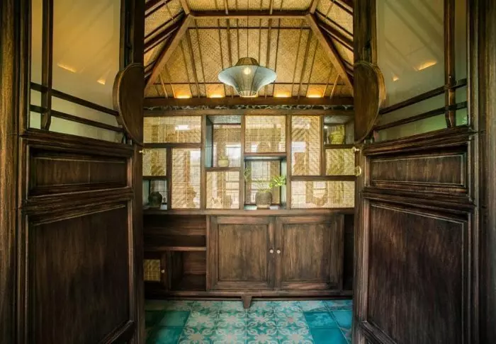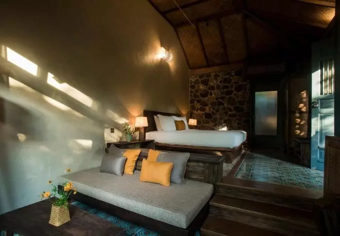 Resortet er økovenligt og bygget i naturlige og bæredygtige materialer og det meste af resortets inventar er fremstillet i fint mørkt træ på resortets eget snedkeri.