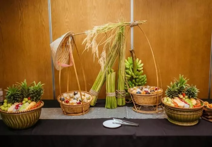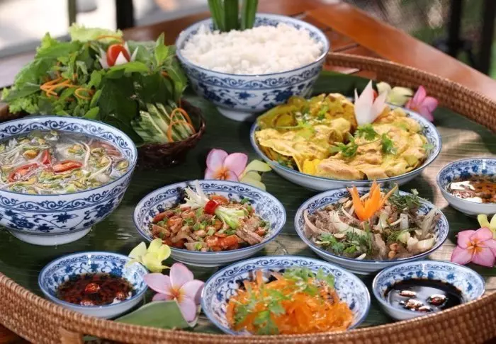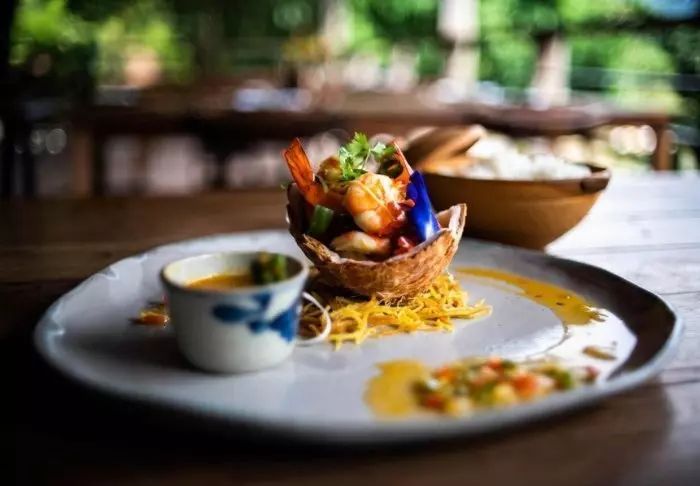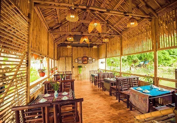 Restaurantens menukort er baseret på lokale råvarer fra området og byder på traditionelle vietnamesiske retter med friske urter, fisk og frugt fra deltaet. Mange af ingredienserne kommer direkte fra hotellets egen have, og maden kan nydes med udsigt til floden, hvor solen langsomt går ned bag palmerne.