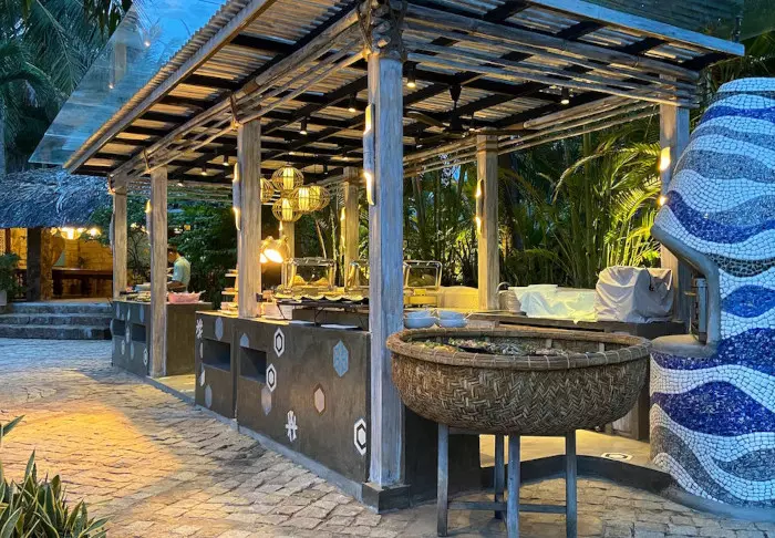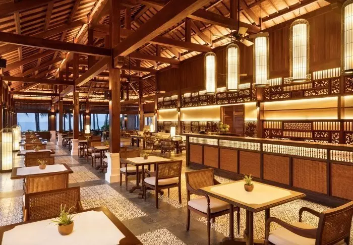 Fra restauranten og baren er der udsigt til pool og strand. Restauranten byder både på vietnamesiske og vestlige retter – alt sammen med et både lokalt og bæredygtigt islæt. Her er noget for alle – også vegetarer og veganere.