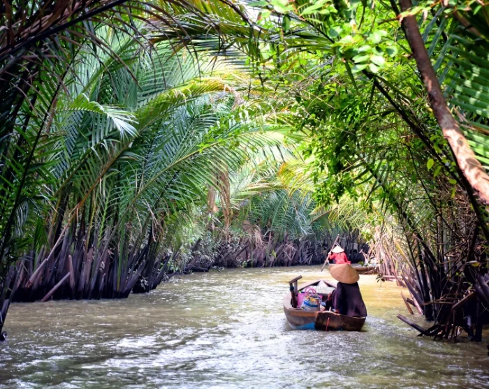 Efter ca. 2,5 times kørsel ankommer du til byen Cai Be. Her går du ombord i en båd og sejler ud på det frodige Mekong-delta. Du besøger lokale værksteder, hvor dygtige kunsthåndværkere fremstiller produkter af kokos. Derefter fortsætter du i en lille sampan – en traditionel, håndroet træbåd – gennem Mekong-deltaets smalle, snørklede kanaler.