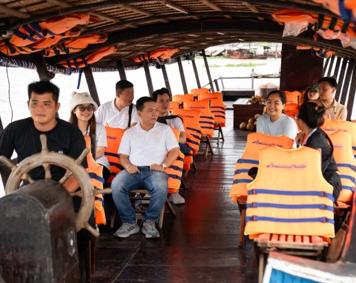 Sejlturen fører dig videre til en fredelig ø midt i Mekong-floden, hvor du nyder en vietnamesisk frokost tilberedt af friske, lokale råvarer, mens du er omgivet af grøn natur og flodens stille liv.
