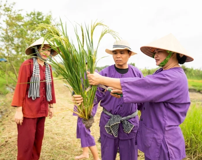 Du fortsætter til vores sociale bæredygtighedsprojekt i Vinh Long, som er startet af vores lokale samarbejdspartner. Her venter en rolig gåtur gennem landsbyen, hvor din guide undervejs giver dig indblik i projektet. Du får også mulighed for at tage del i det traditionelle landbrugsliv. Sammen med lokale bønder prøver du kræfter med risdyrkning, enten ved at plante de spæde risplanter eller ved at hjælpe til med høsten, alt efter sæsonen. Det er en lærerig og jordnær oplevelse, der giver dig et unikt indblik i hverdagen i Vietnams landdistrikter og i det arbejde, der ligger bag et bæredygtigt landbrug. Når du deltager på turen, er du samtidig med til at gøre en forskel for familierne i Vinh Long, da en procentdel af rejsens pris går direkte til projektet, som du kan lære mere om her.