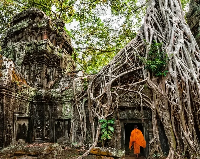 Efter en kort køretur når du frem til Ta Prohm, som adskiller sig fra de øvrige. Store, smukke træer har slået rod midt i ruinerne, så natur og sten nærmest er vokset sammen til én fascinerende helhed.