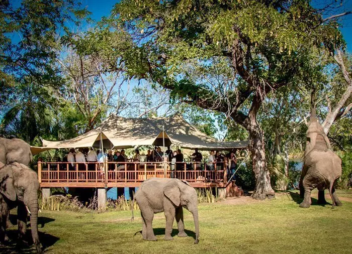 Ved Zambezi-flodens bred – godt 10 km fra Livingstone – ligger Elephant Café. Her bor 10 elefanter, som af den ene eller anden grund ikke længere har deres egen flok. Nogle af elefanterne er reddet fra krybskyttere – andre er født i fangenskab og kan ikke overleve i den frie natur. Elephant Camp er deres hjem. De lever principielt frit og kan gå, hvorhen de vil, men de føler alle en stærk tilknytning til deres dyrepassere og selvom de dagligt går på strejftog i bushen, kommer de altid tilbage.