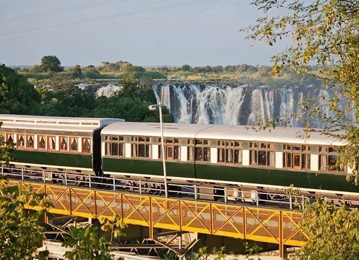 Begge tog har afgang sidst på eftermiddagen. Nyd en velkomstdrink i loungevognen, mens toget i adstadigt tempo bevæger sig mod Victoria Falls Bridge.